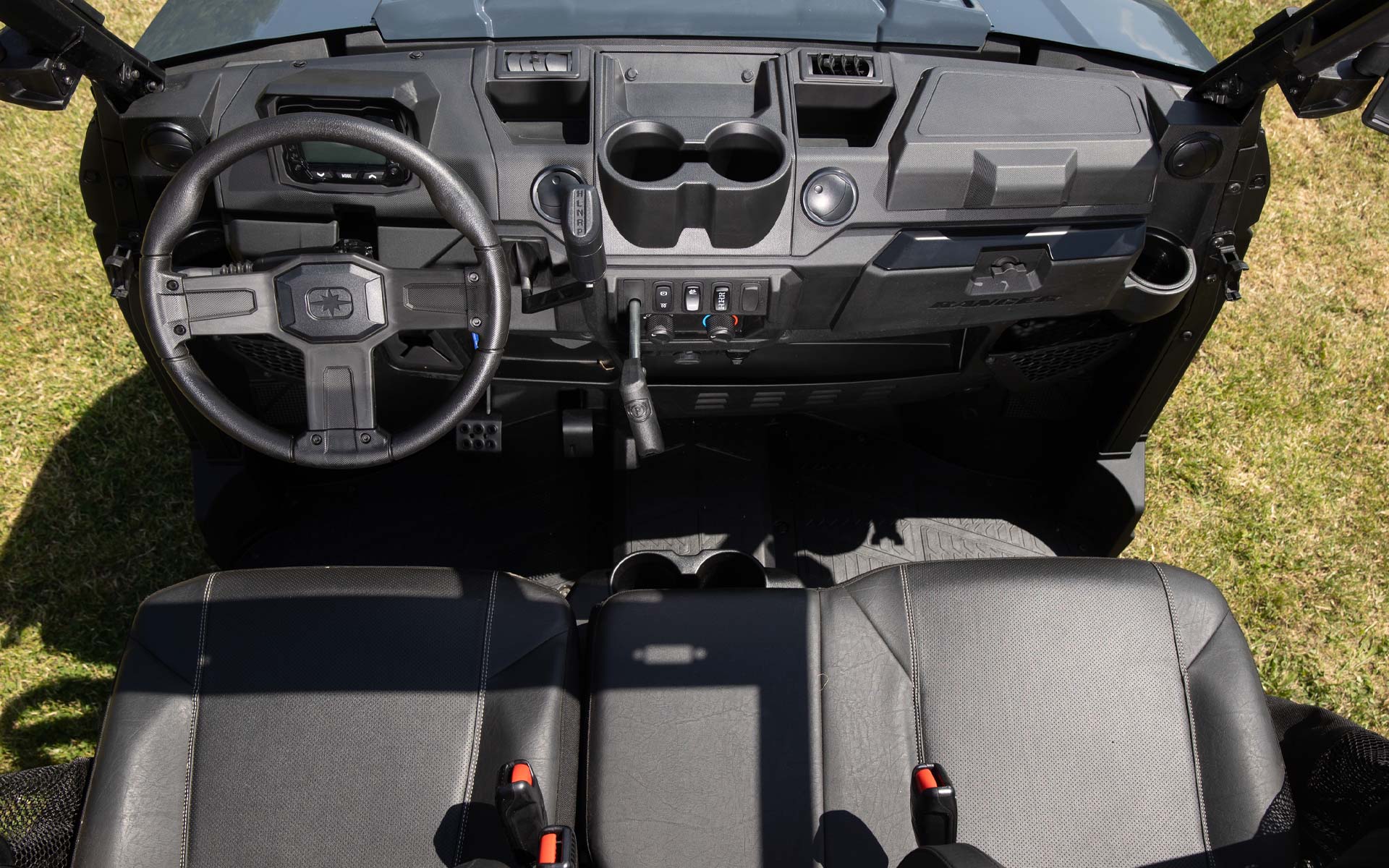 3-person, bolstered bench seat with 3-point harness and adjustable driver seat